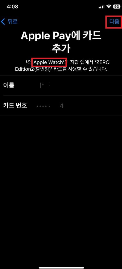 3. 그러면 이제 Apple Watch의 지갑 앱에 등록하는 화면이 뜹니다. 다음을 눌러줍니다. 그러면 Apply Watch에 암호를 설정하라고 나오고 암호 설정을 눌러줍니다.