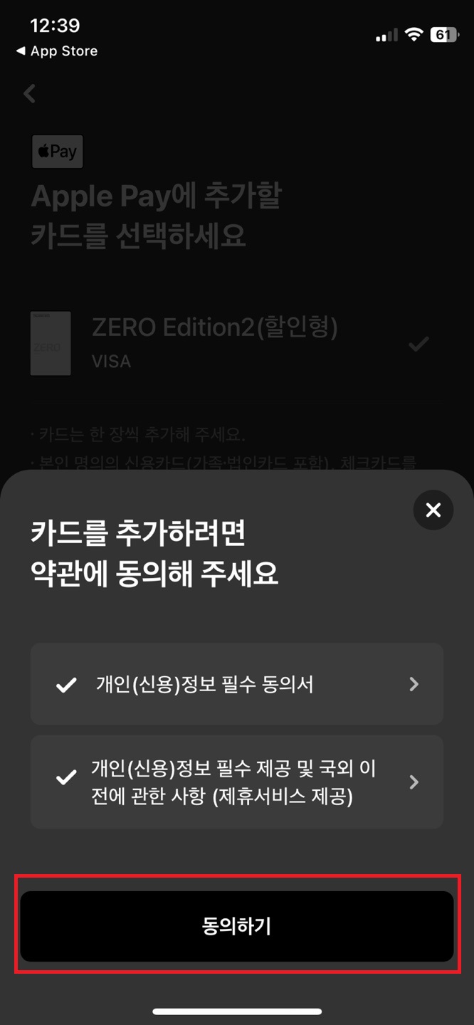 2. 카드 추가 약관에 동의를 해주고, 다 동의를 한 뒤 아래에 동의하기를 선택하여 줍니다.