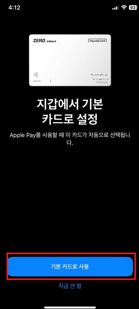 5. 1~2분정도의 시간이 소요되며, 기다리면 이용약관 동의 화면이 나오고 동의를 눌러줍니다. 기본카드로 사용을 선택하여 주면 애플페이 사용할때 이 카드가 바로 선택이 됩니다.