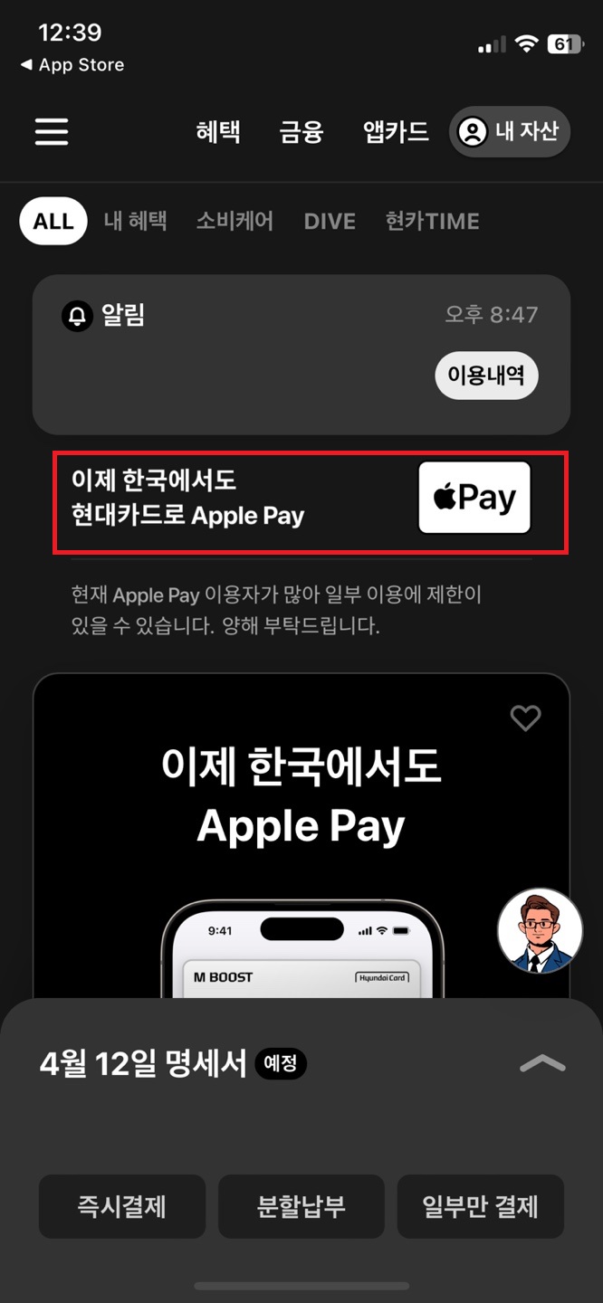 애플페이는 3월 21일 5시에 국내에 출시되었습니다. 국내 결제시장에 출시한 지 하루만에 가입자 100만명을 돌파하면서 인기를 끌고 있습니다.